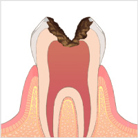 象牙質はエナメル質よりも柔らかいので、ここまで達したむし歯はさらに進行が早くなります。歯髄に近いと、冷たいものなどでしみたり、痛みを感じるようになります。
